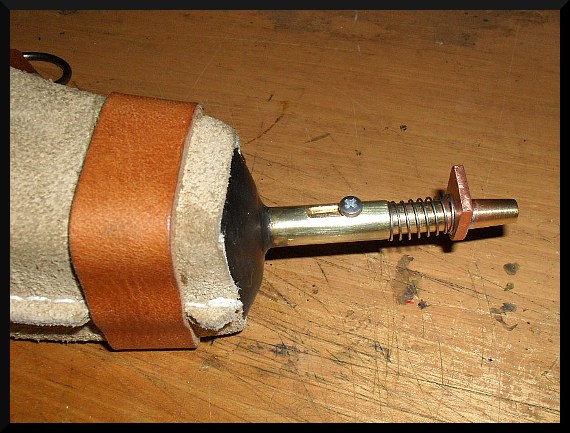 Ventil na sypání prachu je automatický. Jak je vidět na obrázku, je tvořen vnější mosaznou trubičkou 10/8mm, která je vlepená do tělesa prachovnice. V ní je zasunutá posuvně mosazná trubička 8/6mm, která je na straně uvnitř prachovnice na konci uzavřena kulatým plechem, který tvoří zároveň doraz. Z boku je do této trubičky vyvrtaná 6mm díra. Na přední straně trubičky je po nasazení vhodné pružiny připájena kovová podložka. Pokud je trubička pružinou tlačena ven, je boční díra uvnitř prachovnice uzavřena, když se na ústí trubičky zatlačí a zasune se dovnitř, otevře se v prachovnici boční otvor a prach začne sypat trubičkou ven.