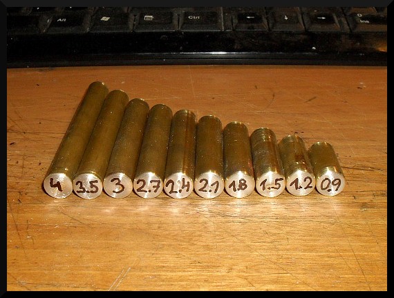 K výrobě odměrek na prach jsem použil ve Feroně zakoupenou mosaznou trubku s vnitřním průměrem 8mm [vnější 10mm].