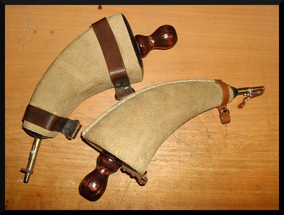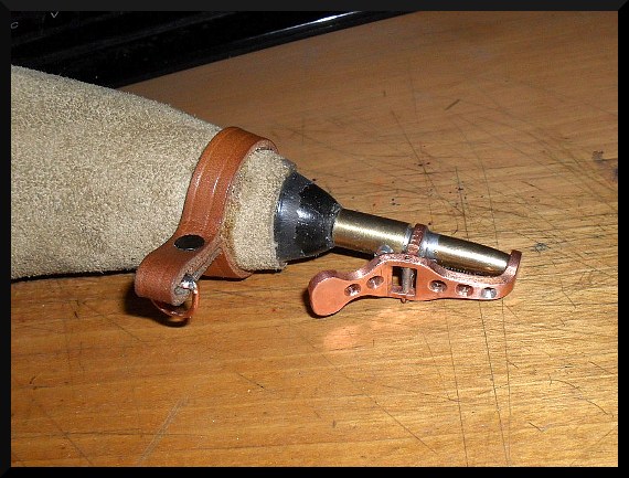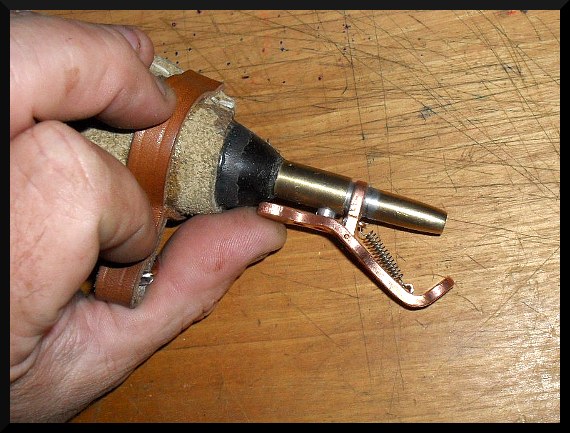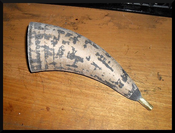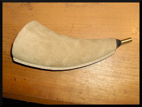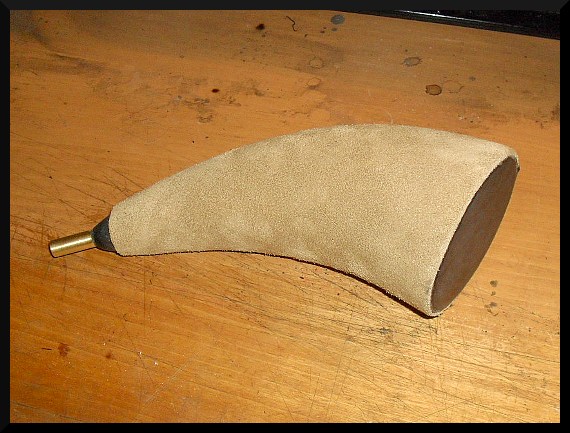 Do spodní části rohu se pak vlepí Epoxydem mosazná trubička s vhodnou zátkou třeba ze dřeva, či na ní vytvořit dle možností jakýkoliv mechanický uzávěr, a na horní konec vyrobíme dle svých schopností a možností dřevěné víko s otvorem uprostřed, které do rohu vlepíme Epoxydem, a do otvoru ve víku například korkovou zátku nalepenou na ozdobném dřevěném "špuntu" pro plnění rohu prachem. Závěsy na zavěšení rohu jsou z kořených řemínků. Na sypání je možné vyrobit i automatický ventilek, ja jej popisuju v článku o dřevěné prachovnici.