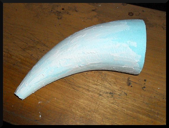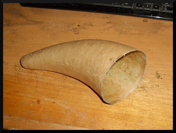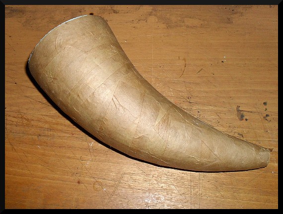 Na tělo rohu budeme potřebovat hnědou papírovou lepící pásku na balíky [tu, co se musí namočit]. Nemějte obavy z pevnosti, dostatečný počet vrstev pásky má velmi vysokou pevnost. Tuto pásku nastříháme na pásky cca 1,5x8 cm. Několik pásků namočíme ve vodě a položíme na tabuli skla, či plechu lepidlem nahoru, dokud se papír nepromočí, aby změknul, a prosáknul lepidlem [páska potom perfektně ztvrdne]. Poté postupně lepíme pásky na polystyrénové "kopyto". Jednotlivé vrstvy překrýváme a křížíme. Vždy po nalepení jedné vrstvy na cca hodinu až dvě celé kopyto omotám elastickým obinadlem, aby se nalepené pásky řádně přitlačily k předchozí vrstvě, a pak obinadlo sundám a lepím další vrstvu. Elastický obvaz je prodyšný, takže i s ním může páska vysychat. Je dobré vždy po cca 3-4 vrstvách nechat pořádně vysušit cca jeden den, a teprve pak pokračovat. Když poklepeme něčím kovovým na dobře vyschlý povrch, už po deseti vrstvách má zvuk jako tvrdé dřevo. Případné vrásky na pásce můžeme vždy po vyschnutí vrstev smirkem 80 přebrousit, než aplikujeme další vrstvy. Nicméně při schnutí se papírové pásky mírně stáhnou, takže nějaké drobné vrásky zmizí. Takto uděláme stěnu rohu cca 2-2,5mm silnou [cca 25 vrstev] a necháme alespoň týden pořádně vyschnout. Už 2mm silná stěna je velmi tvrdá a pevná. Poté povrch tělesa rohu přebrousíme, nerovnosti vytmelíme, a nalakujeme lepidlem Epoxy CHS1200, nebo epoxydovým lakem, a smirky přebrousíme do hladka, to celé tak 3x.