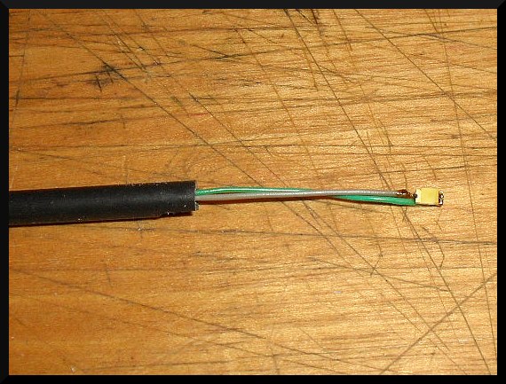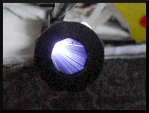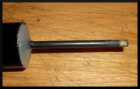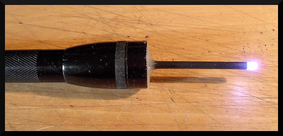 Vyrobil jsem proto speciální světlo, které lze zastrčit přes drum do hlavně a celý vývrt tak krásně osvětlit. Světlo tvoří plastová trubička o průměru 3.5mm, kterou jsou protažené dva tenké izolované dráty, na jejichž konci je připájena miniaturní SMD LEDka bílé barvy velikosti 1206. Konec trubičky je v délce 4mm do poloviny odříznutý, a v takto vzniklém lůžku uložena LEDka. Po jejím uložení do lůžka je zalitá čirým tavným lepidlem. Druhou část světla tvoří stará baterka na dvě tužkové baterie. Z baterky jsem odstranil sklo, parabolu a žárovku. Oba dráty vedoucí trubičkou jsem připájel k objímce pro žárovku, plusový vodič na střed, mínusový na kostru. Poté jsem trubičku s ledkou zalil opět tavným lepidlem na místo původní paraboly.