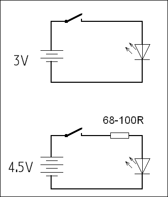 LED musí být standardně napájena přes předřadný odpor, ale v tomto případě to není nutné, protože napájecí napětí ze dvou tužek je nižší, než úbytek napětí na bílé LED, a tudíž proud nedosáhne maximální povolené hodnoty. V případě, že by byla použita baterka na tři články, bylo by už nutné použít před LEDku předřadný odpor, vypočítaný dle ohmova zákona. Pro tři články, tedy napětí 4.5V, by odpor měl mít hodnotu 60 Ohmů, tedy nelbližší vyšší hodnou, což je 68 Ohmů. Použijeme tedy odpor 68-100 Ohmů. Schemata jsou pod fotografiemi.